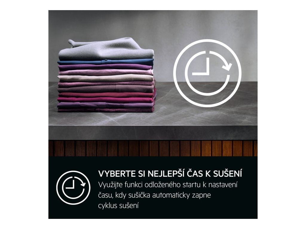 | Možnost nastavení odloženého startu: | Přejete-li zapnout sušičku v době kdy je levnější proud, nebo mít prádlo usušené ráno hned po probuzení je vhodné použít funkci odloženého startu. |